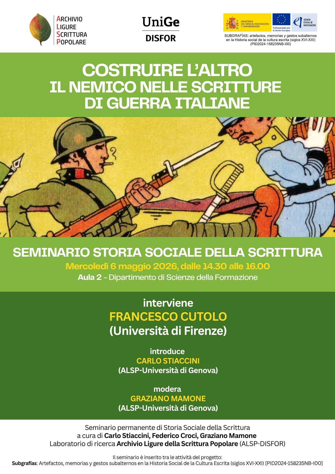 Il 6 maggio 2026, dalle 14.30 alle 16.00, l'ALSP ospiterà l'intervento di Francesco Cutolo, dell'Università di Firenze che, a partire dalla pubblicazione recente di un suo libro (Uomini come noi. Il nemico nelle scritture dei soldati italiani (1915-18), Ospedaletto Pisa, Pacini, 2025), tratterà il tema Costruire l'altro. Il nemico nelle scritture di guerra italiane.